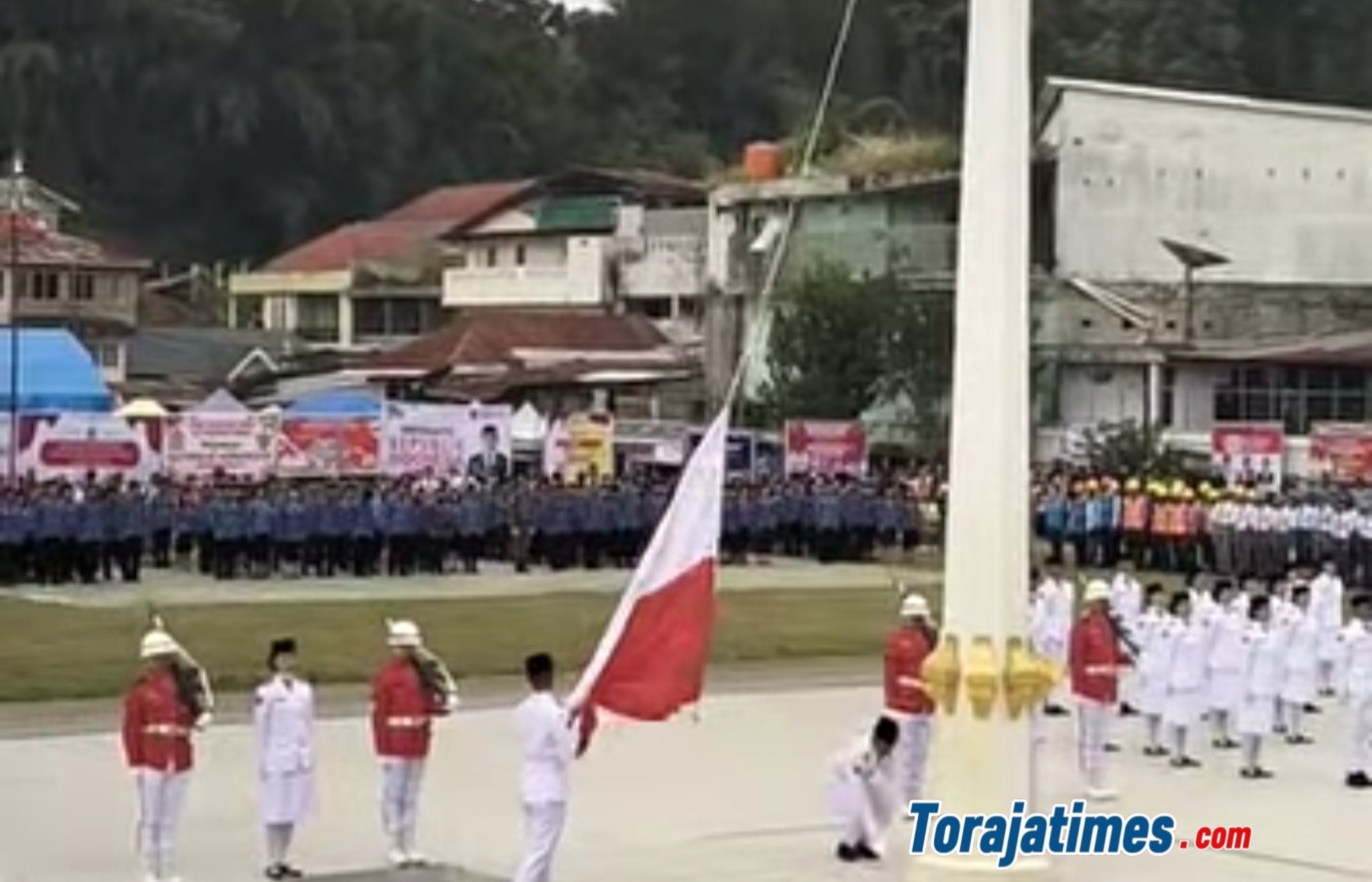 Upacara HUT Kemerdekaan RI Ke 80 di Warnai Insiden, saat penaikan bendera Sang Saka Merah Putih terlihat terbalik, Minggu (17/8/2025). Dok/foto: torajatimes.com