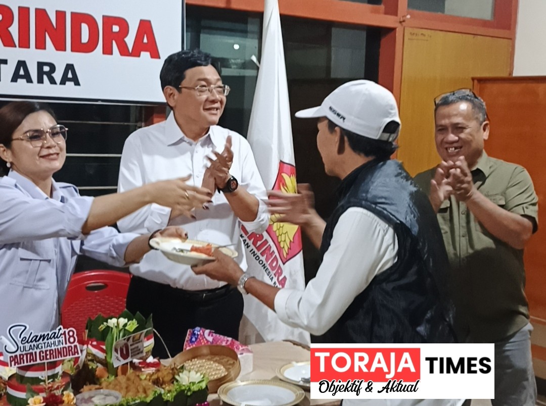 HUT ke-18 Gerindra Toraja Utara Digelar Sederhana Namun Sarat Makna, Bupati Frederik Palimbong Potong Tumpeng Ajak Wartawan