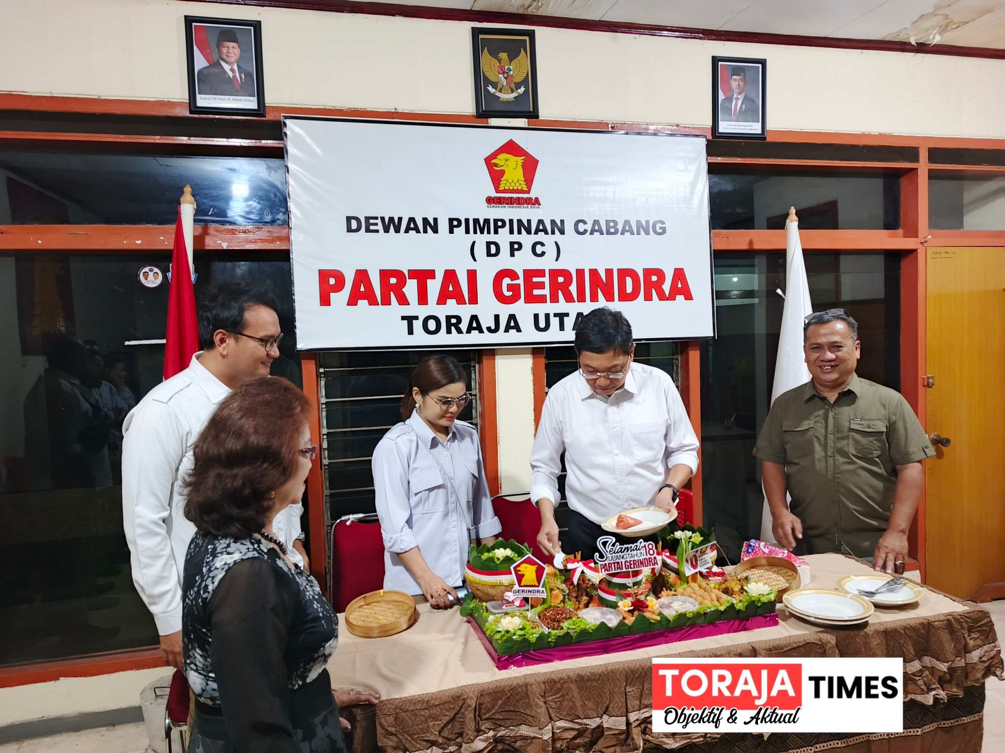 Kegiatan HUT Ke 18 Partai Gerindra yang berlangsung di Kantor DPC Partai Gerindra Kabupaten Toraja Utara itu dihadiri jajaran pengurus DPC, anggota DPRD Kabupaten Toraja Utara Fraksi Gerindra, serta puluhan wartawan juga hadir menyaksikan potong tumpeng oleh Ketua DPC Gerindra yang juga Bupati Toraja Utara, Frederik Victor Palimbong.