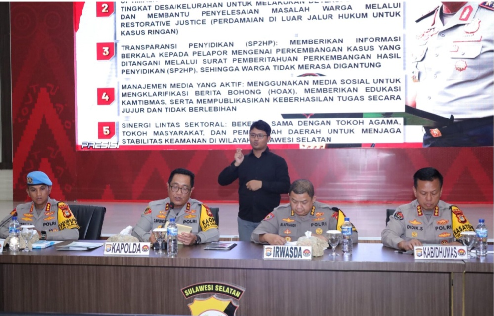 Menutup paparannya, Kapolda Sulsel menegaskan bahwa Polda Sulawesi Selatan telah berupaya maksimal dalam melaksanakan tugas pokok Polri, yaitu memelihara keamanan dan ketertiban masyarakat, memberikan perlindungan, pengayoman, dan pelayanan kepada masyarakat, serta melakukan penegakan hukum secara objektif, transparan, dan akuntabel.