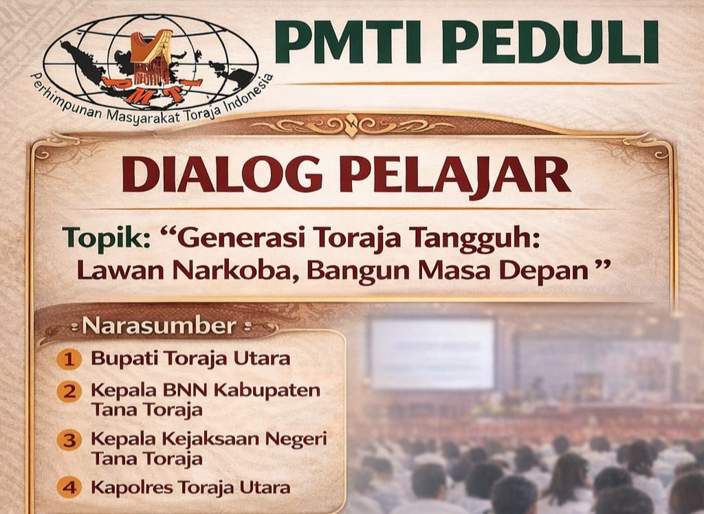 TORAJA UTARA, Torajatimes.com | Perhimpunan Masyarakat Toraja Indonesia (PMTI) akan menggelar dialog terkait bahaya Narkoba. Dialog ini akan menghadirkan para pelajar se Kabupaten Toraja Utara yang renacananya akan di laksanakan pada Selasa 21 April 2026 bertempat di Aula SMA Negeri 1 Toraja Utara.