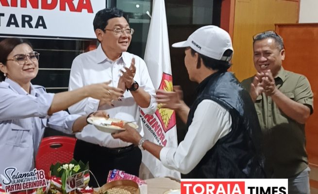 HUT ke-18 Gerindra Toraja Utara Digelar Sederhana Namun Sarat Makna, Bupati Frederik Palimbong Potong Tumpeng Ajak Wartawan